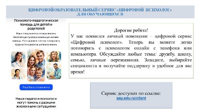 У вас появился личный помощник – цифровой сервис «Цифровой психолог». Теперь вы можете легко поговорить с психологом онлайн с телефона или компьютера. Обсуждайте любые темы: дружбу, школу, семью, личные переживания. Сервис доступен по ссылке: https://psy.edu.ru.